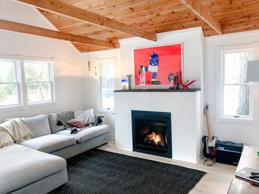Features include: custom modern plywood stairs, various benches with custom cut vents for HVAC, recessed shadow edges instead of base trim and open storage space.